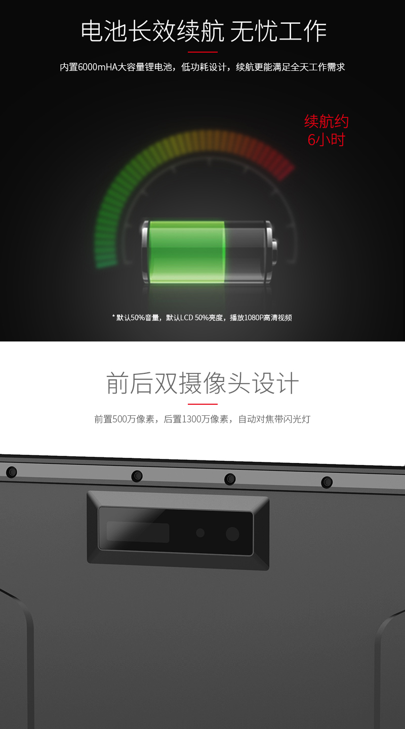 | 续航时间 | 约6小时(默认50%音量,默认LCD50%亮度,播放1080P高清视频) | |